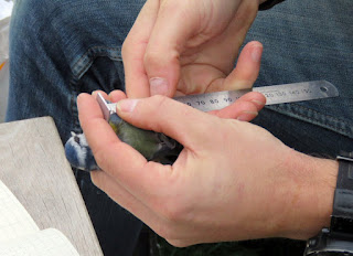 The Manx Wildlife Trust runs many events for the general public throughout the year catering for all age groups  - everything from adult education courses to children's rock pooling sessions. Although those of us who are signed up members of the Trust are just happy to see our subscription used for the benefit of wildlife generally, it's always nice to enjoy the occasional  membership "perk" ! This might be a conducted tour by the Reserves Officer round one of the reserves normally closed to the public or, as on Friday, a bird ringing demonstration at Ballachurry Reserve by the two Calf Wardens, Aron Sapford and Robert Fisher.  For those of you  who are perhaps not local, The Calf of Man is a small island with a bird observatory located off the south of the Isle of Man. The wardens monitor wildlife there from spring to autumn. Spring and Autumn bird migrations are particularly important.